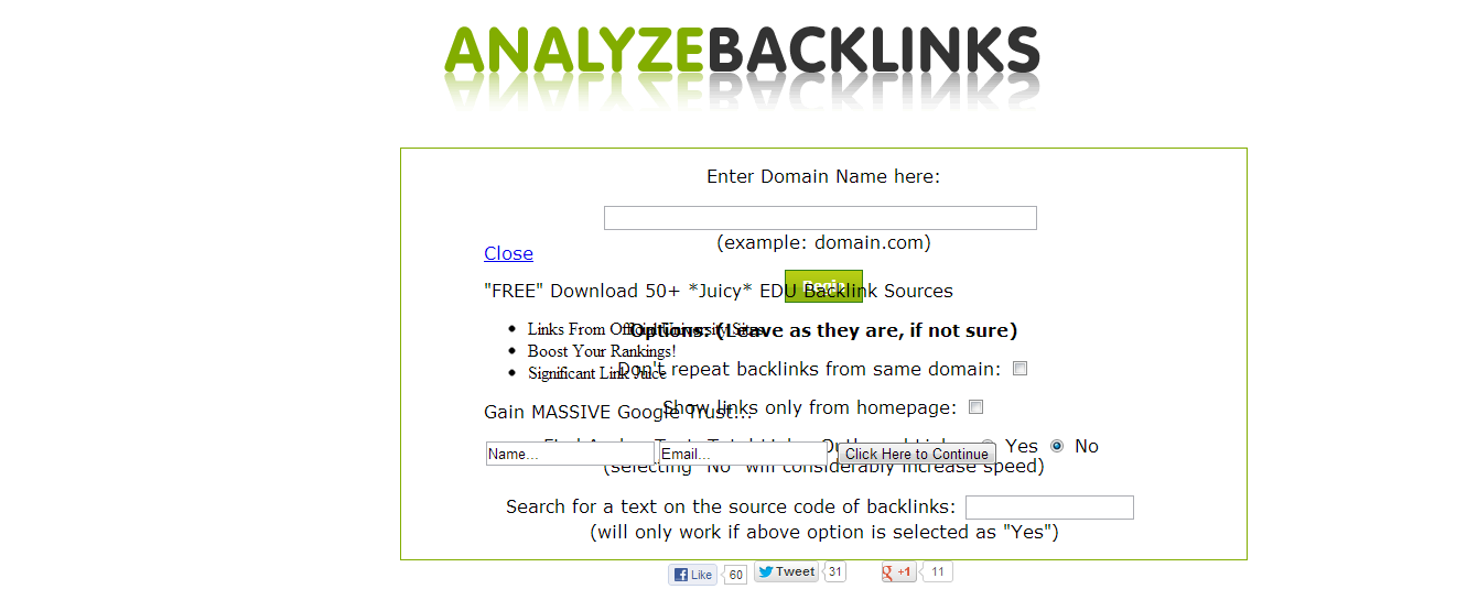 Analyze Backlinks is one of the best backlink checker tools which avoids the repetiton of domain while showing the backlinks of your competitor. You can use the power of analyze backlinks in order to spy down your competitors backlinks. It is commonly known as “Yahoo Site Explorer Alternative” and works effectively. It also offers you to generate a list of backlinks which you can save for future purposes.